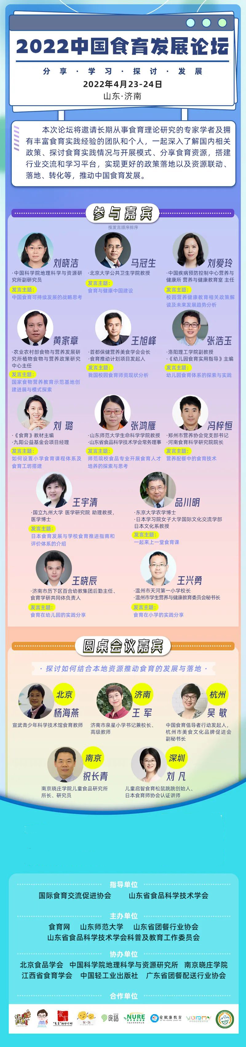 2022年4月23-24日,在山东省食品科学技术学会、国际食育交流促进协会的支持下,由食育网、山东师范大学、山东省团餐行业协会、山东省食品科学技术学会科普及教育工作委员会联合主办的“2022 中国食育发展论坛”将在山东济南组织召开。