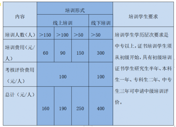 3.社会人员初级培训考核费用线下为1000元/人,线上为800元。学生单独报名线上400元/人,需学生证