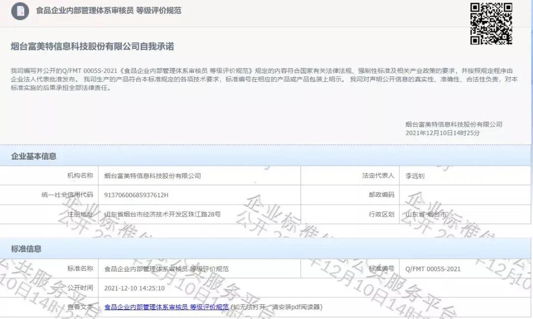 2021年12月10日,食品伙伴网旗下的烟台富美特信息科技股份有限公司(下称“食品伙伴网”)编写的Q/FMT 0005S-2021《食品企业内部管理体系审核员 等级评价规范》在国家标准化管理委员会企业标准信息公共服务平台公开发布。该标准对食品及相关企业内部管理体系审核员进行了评价等级划分,并明确了各等级的申请要求、资格经历要求、审核经历要求、个人素质要求、知识和技能要求、考核要求等,涵盖领域包括:内部质量管理体系、内部环境管理体系、内部职业健康安全管理体系、内部食品安全管理体系、内部危害分析与关键控制点管理体系。该标准的发布,正式将食品企业内部管理体系审核员的等级评价进行了标准化、规范化。