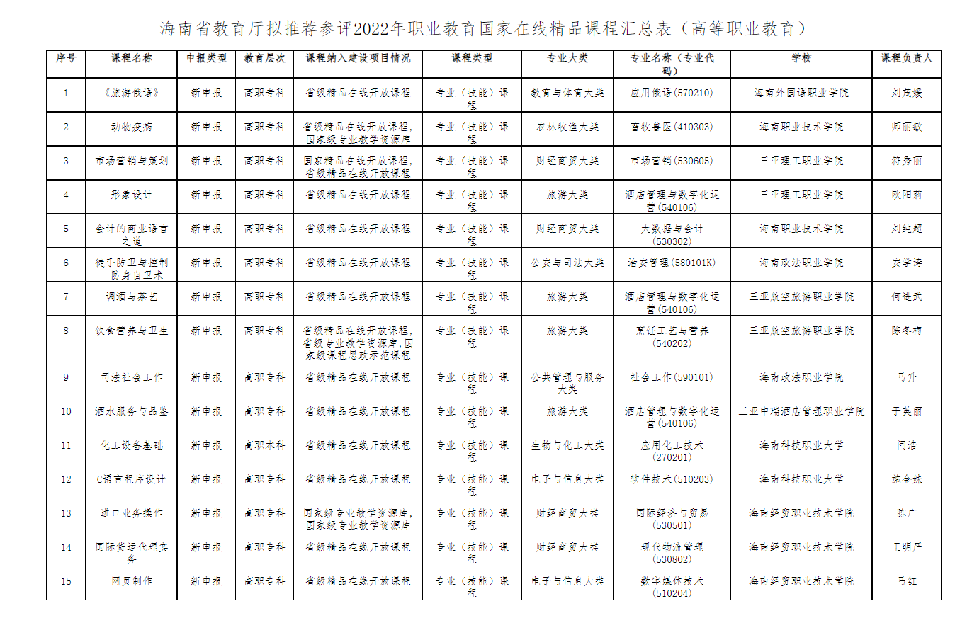 根据《教育部办公厅关于开展2022年职业教育国家在线精品课程遴选工作的通知》(教职成厅函〔2022〕18号)要求,经学校申报、我厅评审,拟将《旅游俄语》等15门课程推荐参评2022年职业教育国家在线精品课程(具体课程名单见附件),现予以公示。公示时间为5天(即2022年9月8日-2022年9月12日)。