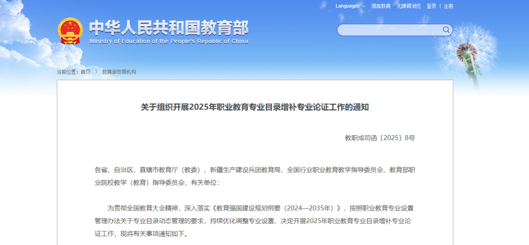 2025年7月,教育部职成司发布《关于组织开展2025年职业教育专业目录增补专业论证工作的通知》,其主要任务显示,围绕国家战略和区域、行业高质量发展新需求,促进专业设置与区域产业布局紧密对接,在现行《职业教育专业目录(2021年)》基础上,对职业教育中职、高职专科、职业本科专业目录提出增补专业建议。
