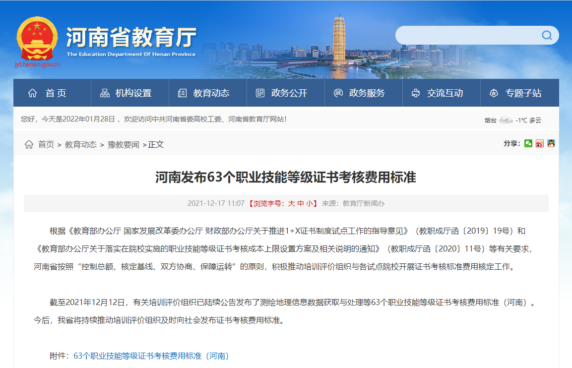 2021年12月17日,河南省教育厅发布63个职业技能等级证书考核费用标准,其中食品合规管理职业技能等级证书考核费用标准也在此次公示的证书名单中。 后续,烟台富美特作为评价组织将继续与各省推进考核费用标准核定工作,保障证书考核评价工作顺利开展。