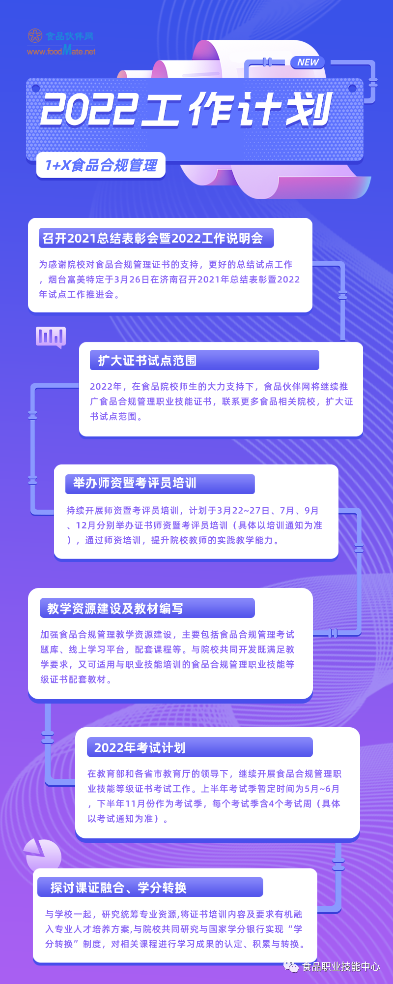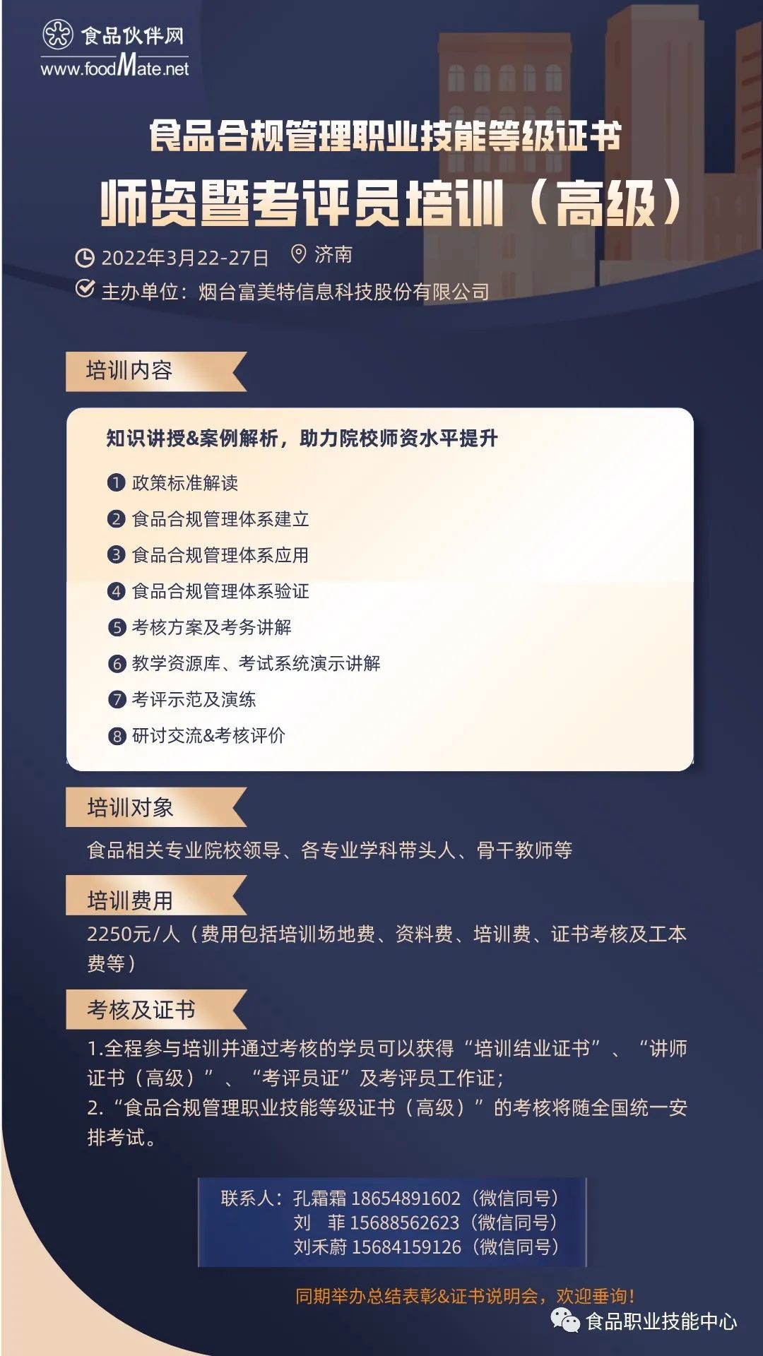 烟台富美特定于2022年3月22-27日,举办1+X食品合规管理职业技能等级证书师资暨考评员培训,欢迎各院校老师报名咨询!