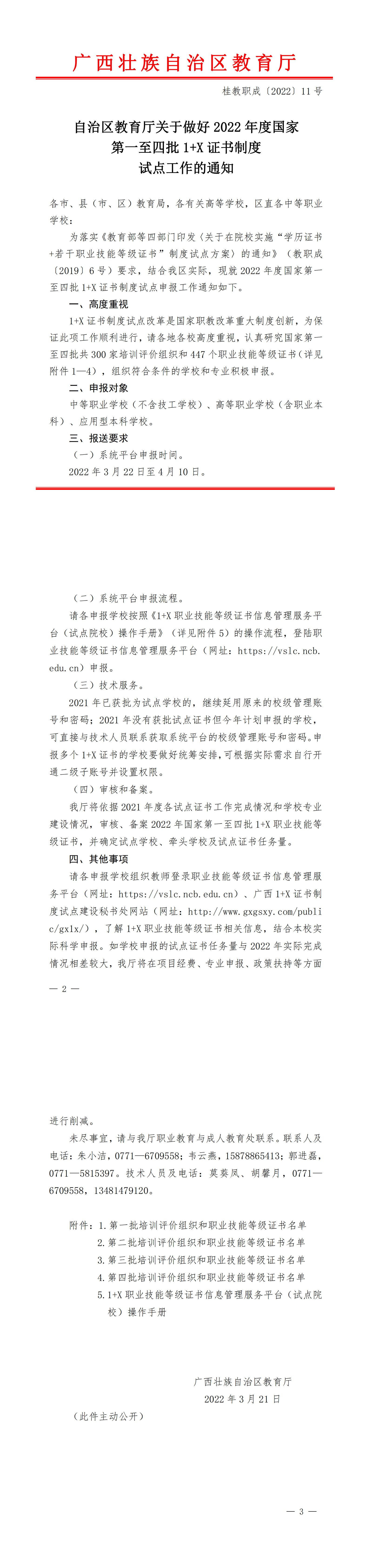 【通知】广西壮族自治区教育厅关于做好 2022 年度国家 第一至四批 1+X 证书制度 试点工作的通知