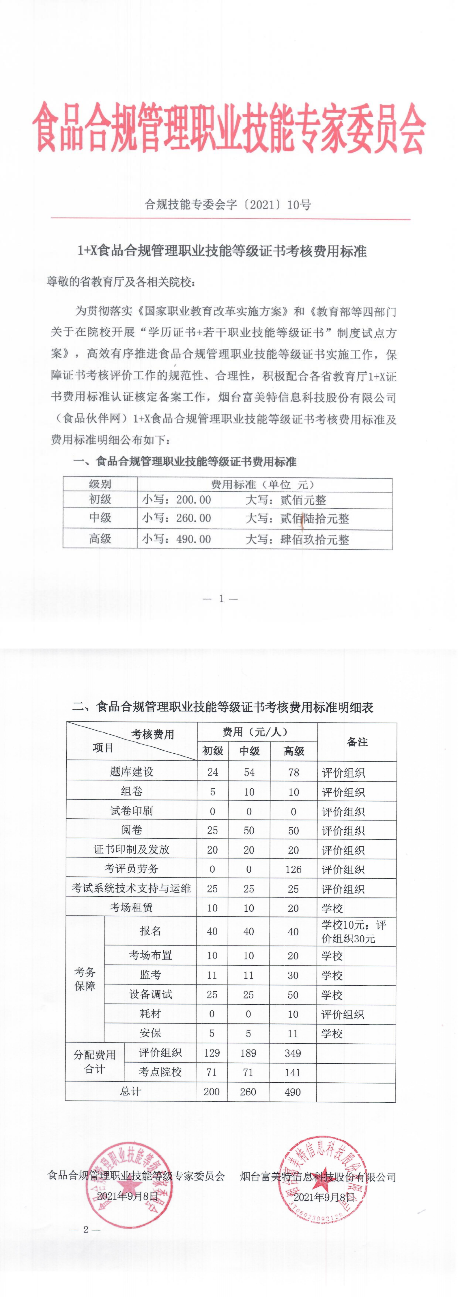 【费用公示】1+X食品合规管理职业技能等级证书考核费用标准