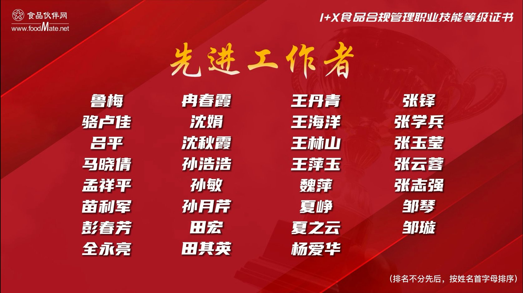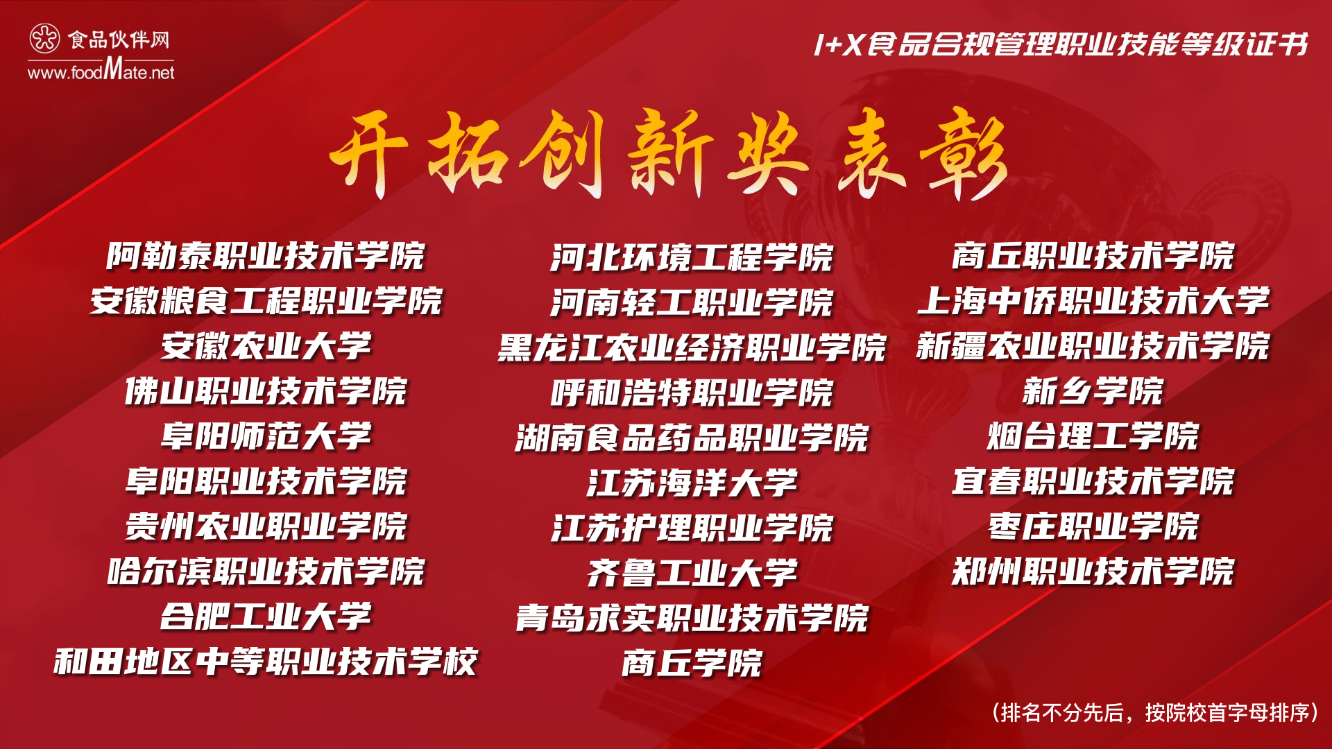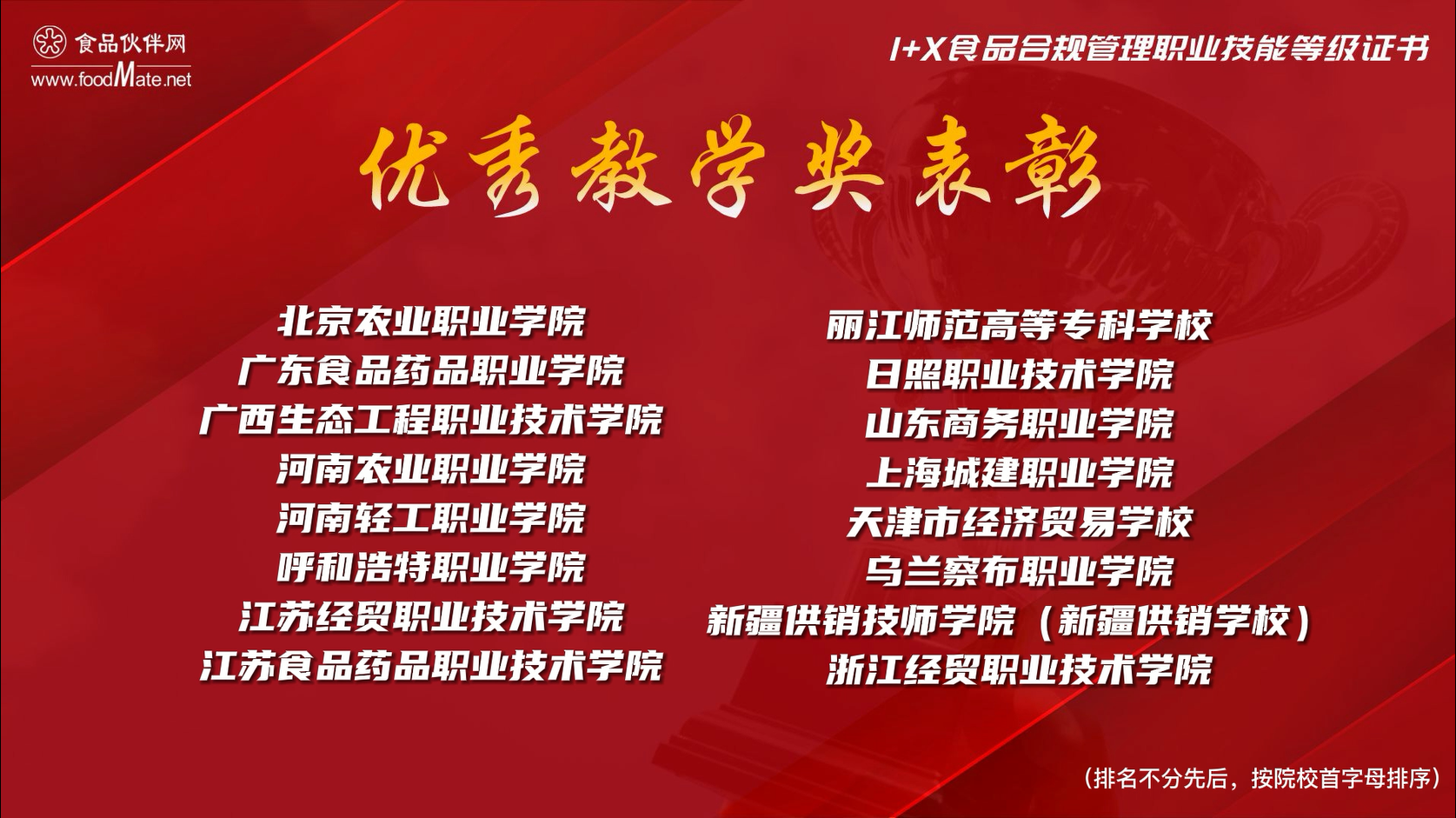2022年我们在证书建设,证书推广,培训教学,教学资源建设以及证书考核方面都取得了较大的突破。这些成绩的取得离不开诸多院校领导老师的指导、帮助和支持。为更好的总结表彰2022年食品合规管理职业技能等级证书工作的突出贡献,我们设置了5个院校奖项,分别是领军院校奖、优秀教学奖、优秀组织奖、全国考核优秀单位和开拓创新奖,另外2个个人奖项,分别是优秀培训教师和先进工作者。