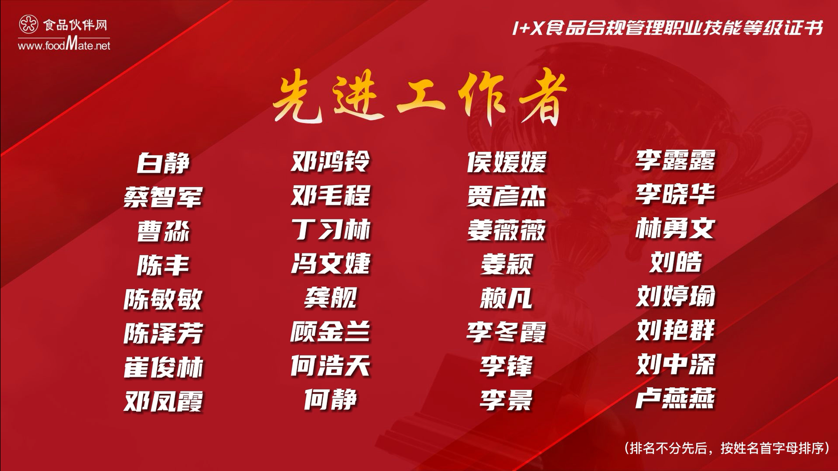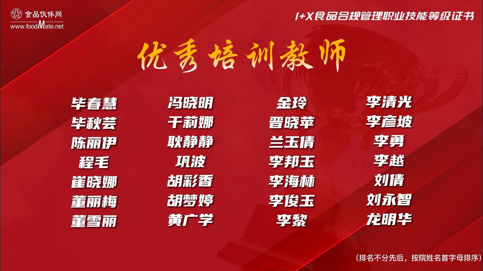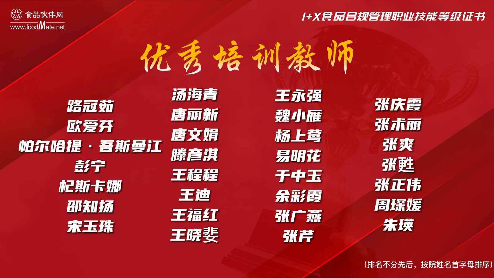 2022年我们在证书建设,证书推广,培训教学,教学资源建设以及证书考核方面都取得了较大的突破。这些成绩的取得离不开诸多院校领导老师的指导、帮助和支持。为更好的总结表彰2022年食品合规管理职业技能等级证书工作的突出贡献,我们设置了5个院校奖项,分别是领军院校奖、优秀教学奖、优秀组织奖、全国考核优秀单位和开拓创新奖,另外2个个人奖项,分别是优秀培训教师和先进工作者。