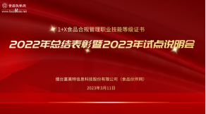 2023年3月11日,烟台富美特信息科技股份有限公司(食品伙伴网)举办的1+X食品合规管理职业技能等级证书2022年总结表彰会暨2023年试点工作说明会在食品伙伴网食学宝平台顺利召开,来自全国各地上百所院校的千余位院校教师、学生代表及行业专家在线参与交流。