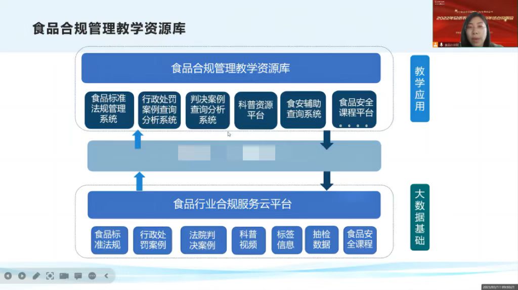 为了配套证书的培训考核机制,除了配套教材建设,我们特地开发了针对食品院校的食品合规管理职业技能学习平台,平台融合了食品合规管理过程中一些常用的数据库和管理系统,实现了食品合规信息的在线查询、在线培训、在线学习模拟考核等功能,可以非常好的辅助院校证书的培训与教学工作。食品伙伴网产品经理宋玉洁老师也对1+X食品合规管理教学资源库进行了讲解和演示。