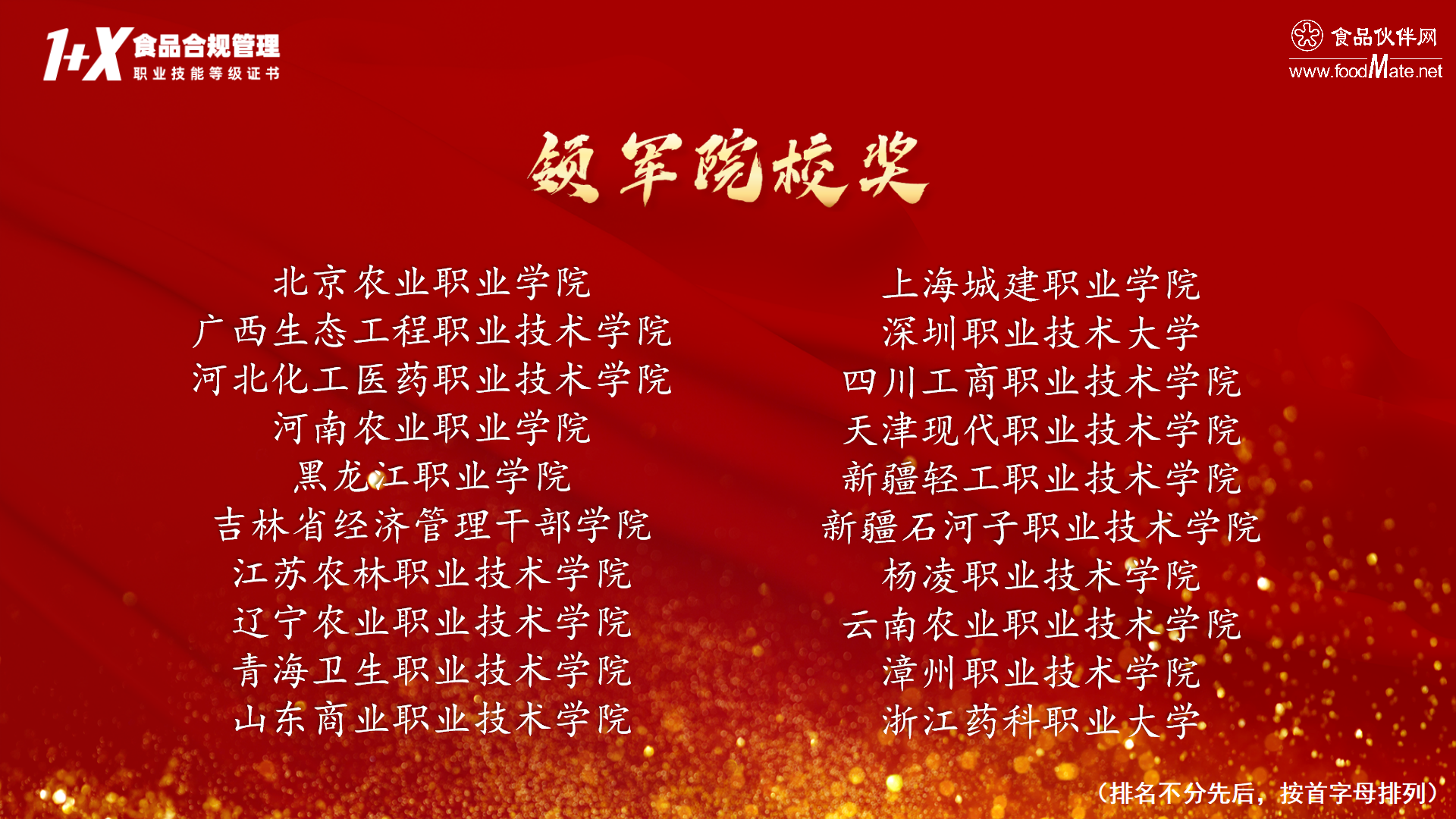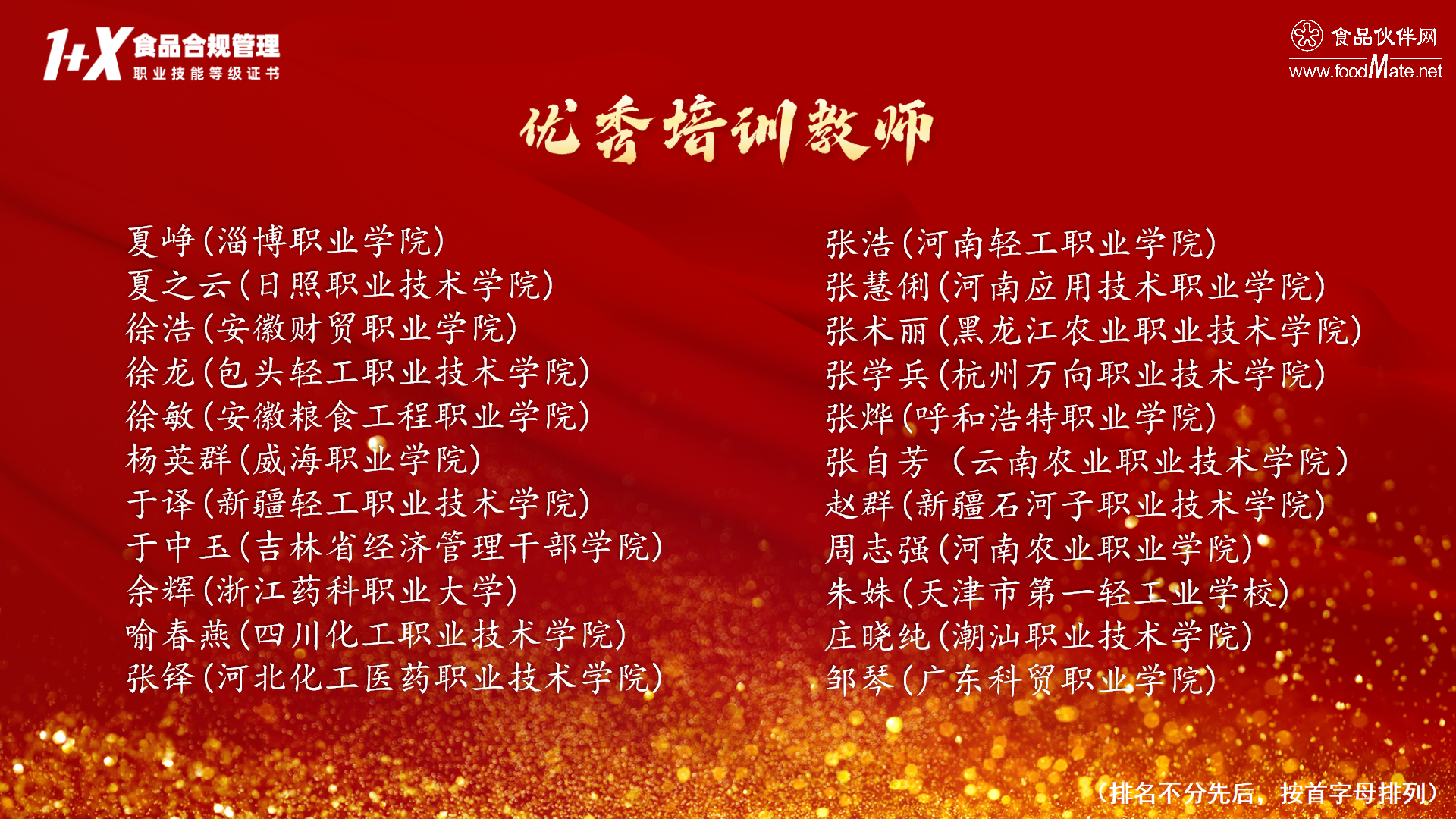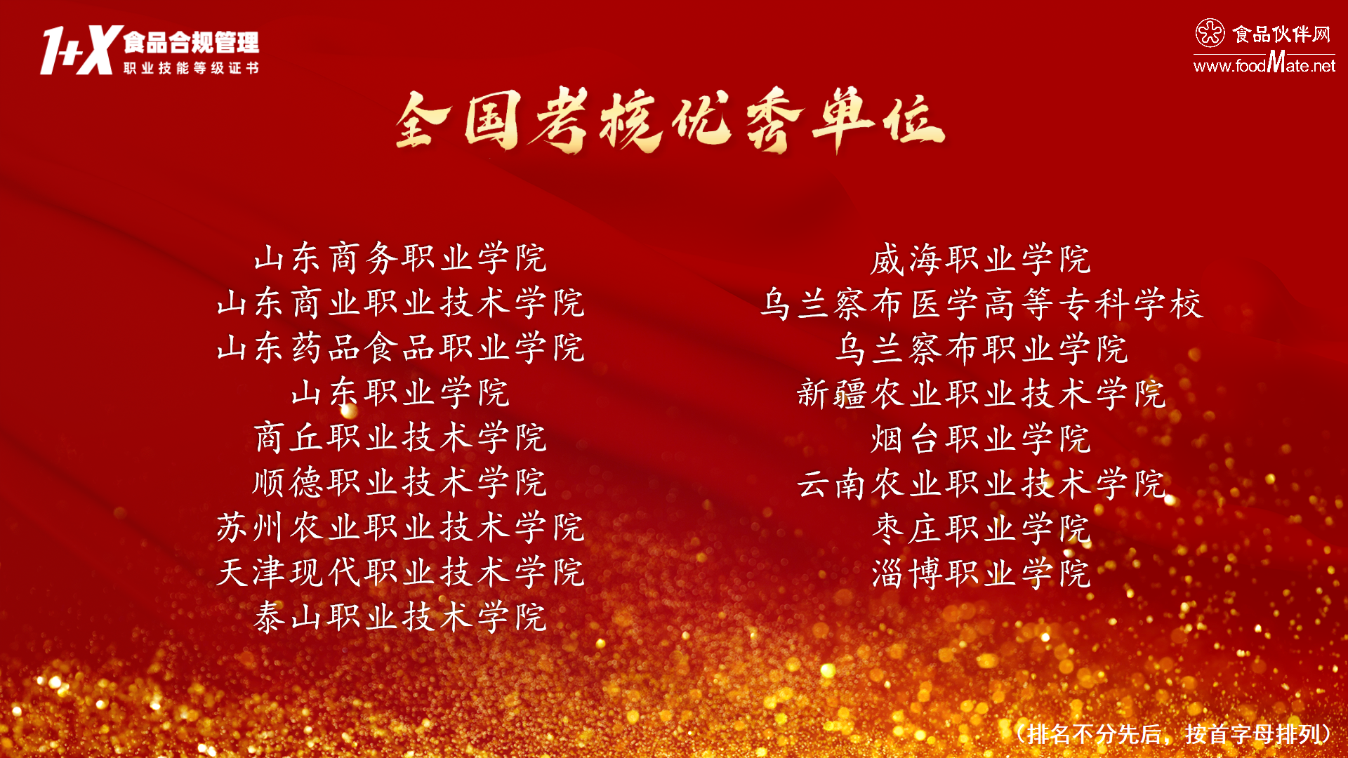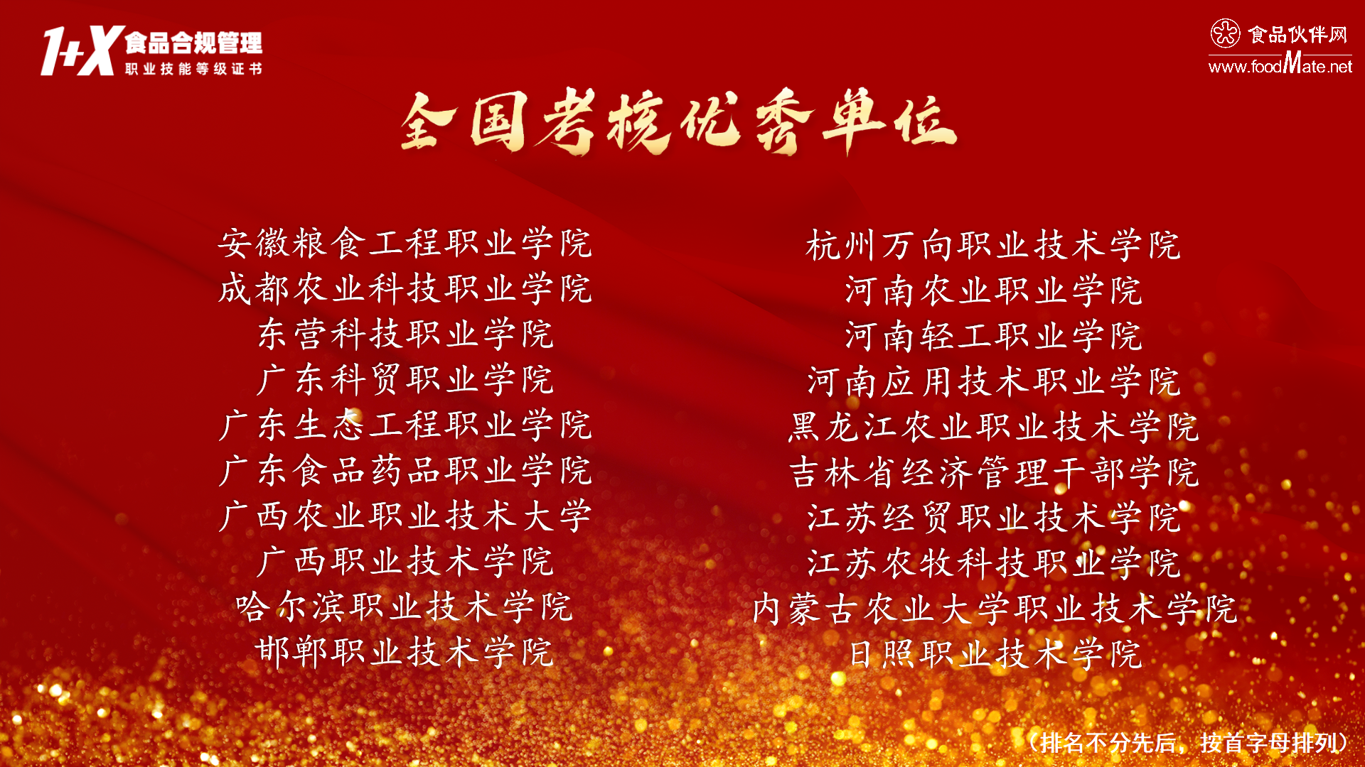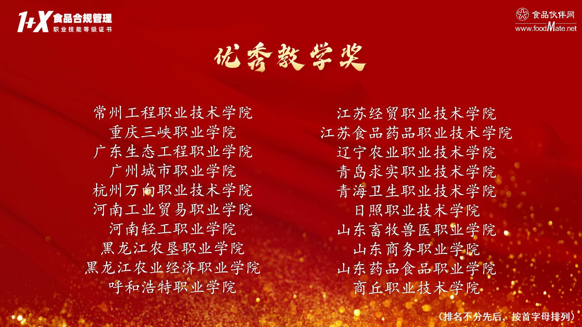 2023年食品伙伴网在证书建设,证书推广,培训教学,教学资源建设以及证书考核方面都取得了较大的突破,这些成绩的取得离不开诸多院校领导老师的指导、帮助和支持!2023年度工作表彰会对优秀院校和个人进行表彰,分别是领军院校奖20个,优秀教学奖31个,全国考核优秀单位37个,优秀组织奖52个,开拓创新奖7个,优秀培训教师62位,先进工作者66位。