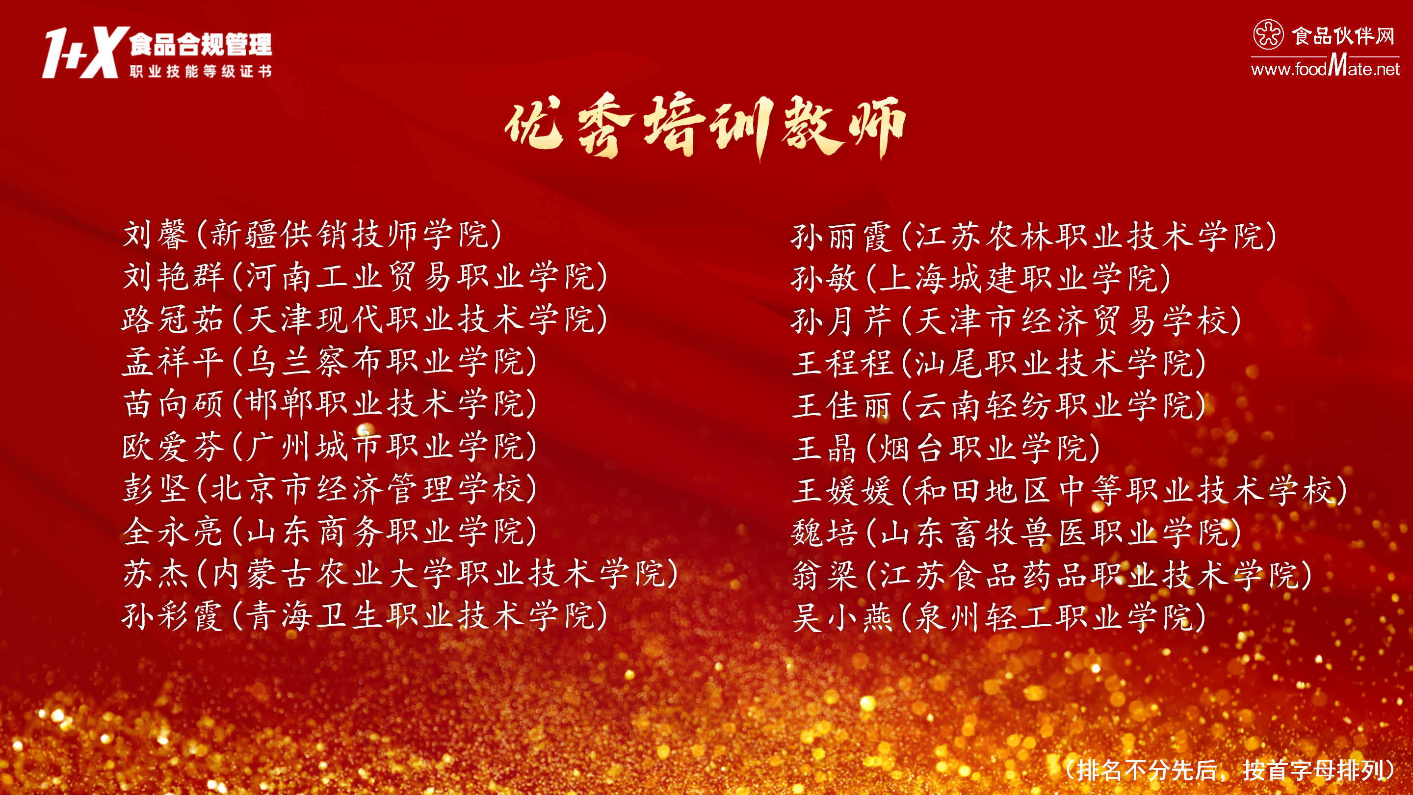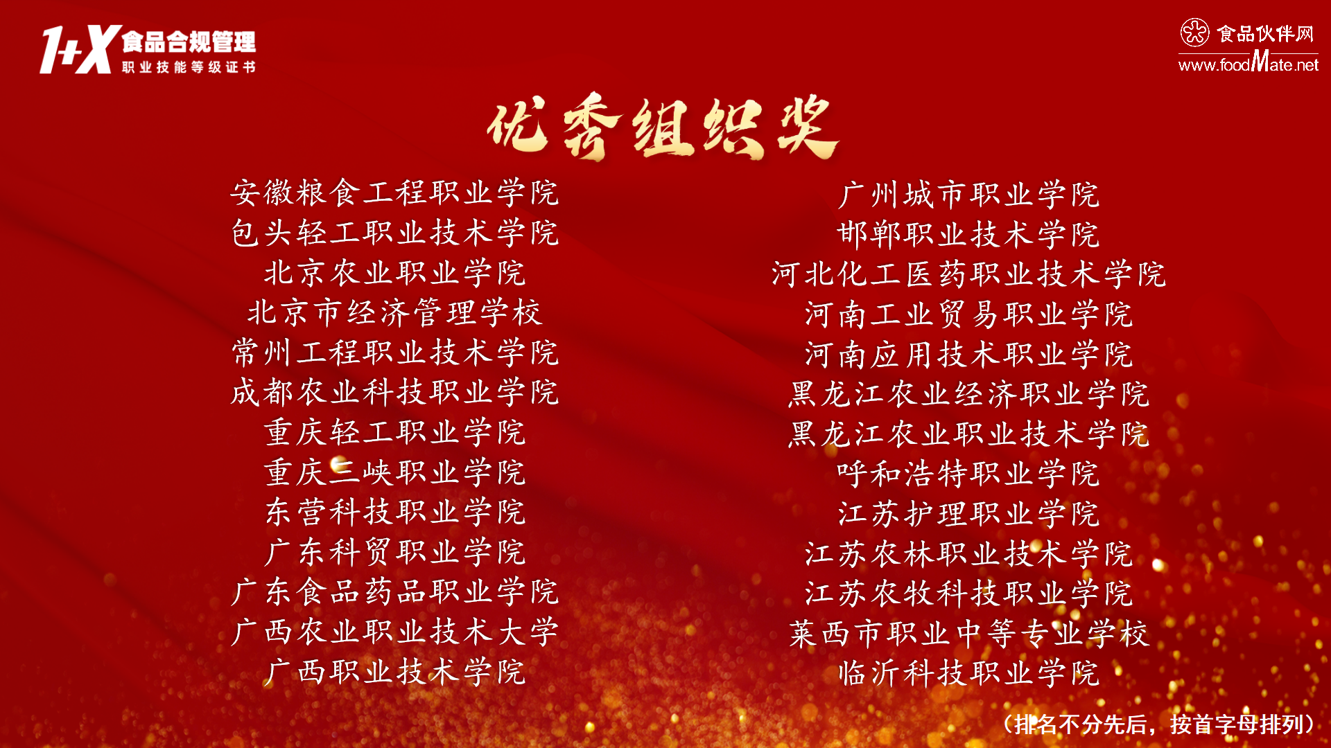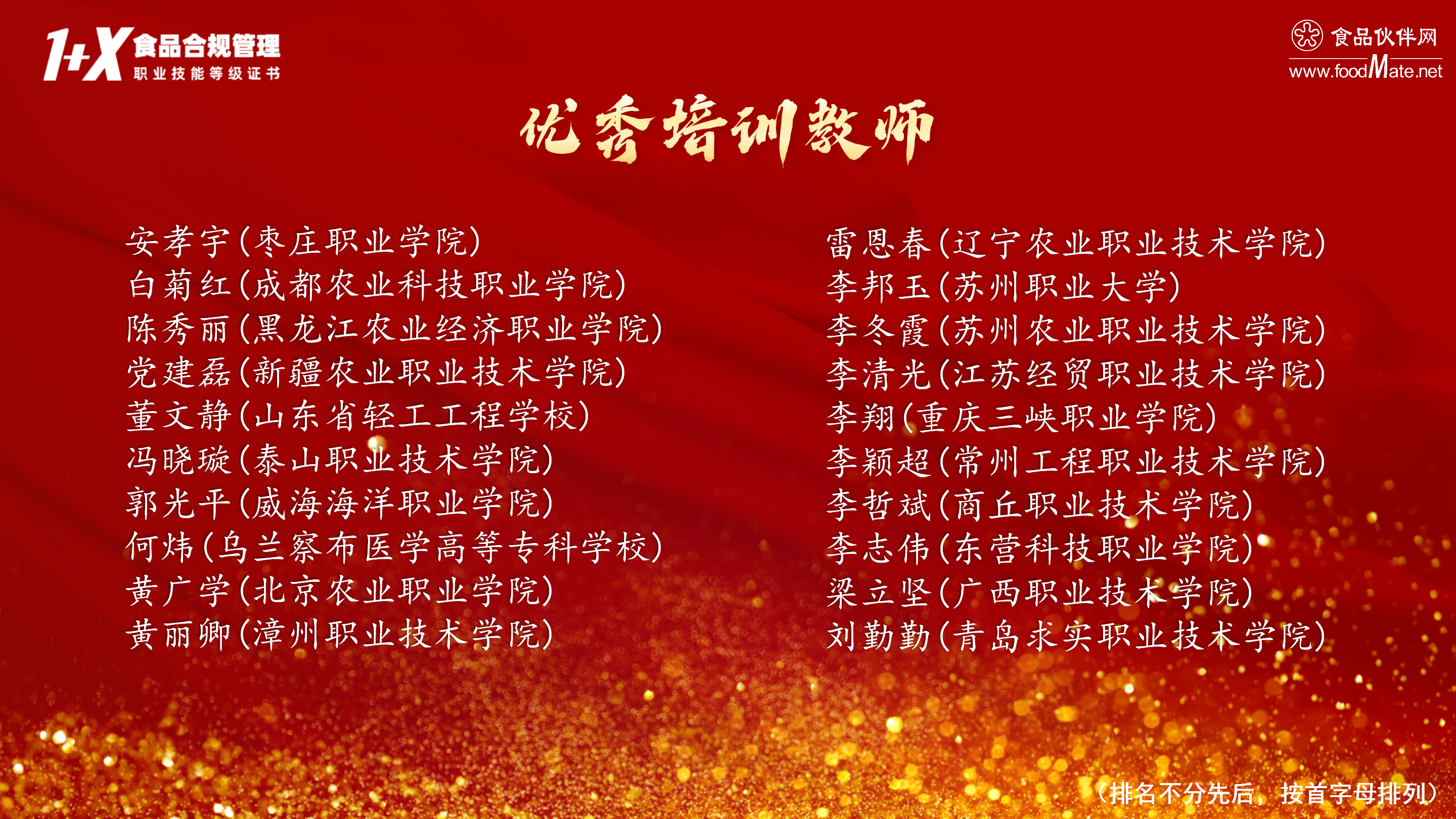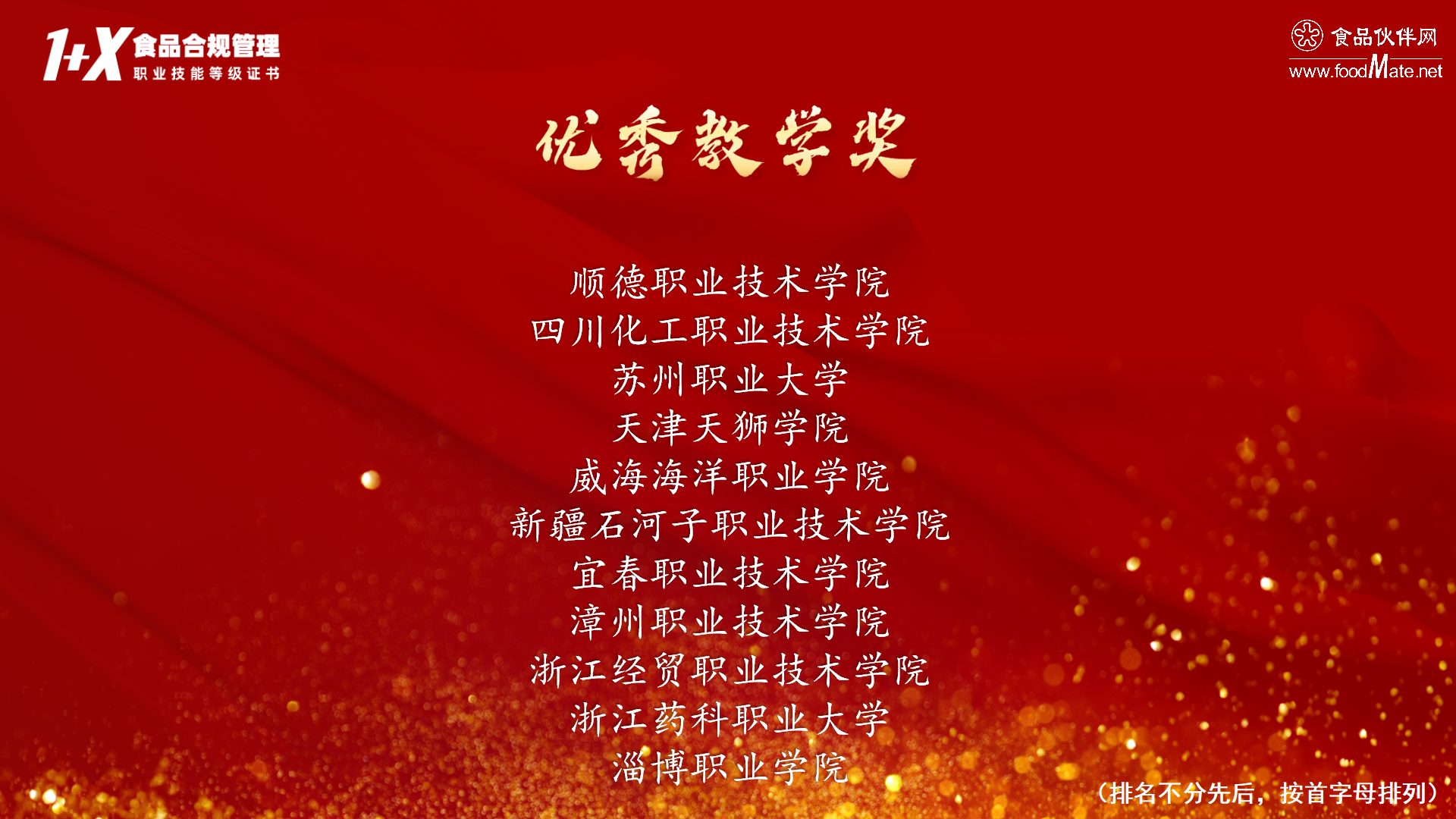 2023年食品伙伴网在证书建设,证书推广,培训教学,教学资源建设以及证书考核方面都取得了较大的突破,这些成绩的取得离不开诸多院校领导老师的指导、帮助和支持!2023年度工作表彰会对优秀院校和个人进行表彰,分别是领军院校奖20个,优秀教学奖31个,全国考核优秀单位37个,优秀组织奖52个,开拓创新奖7个,优秀培训教师62位,先进工作者66位。