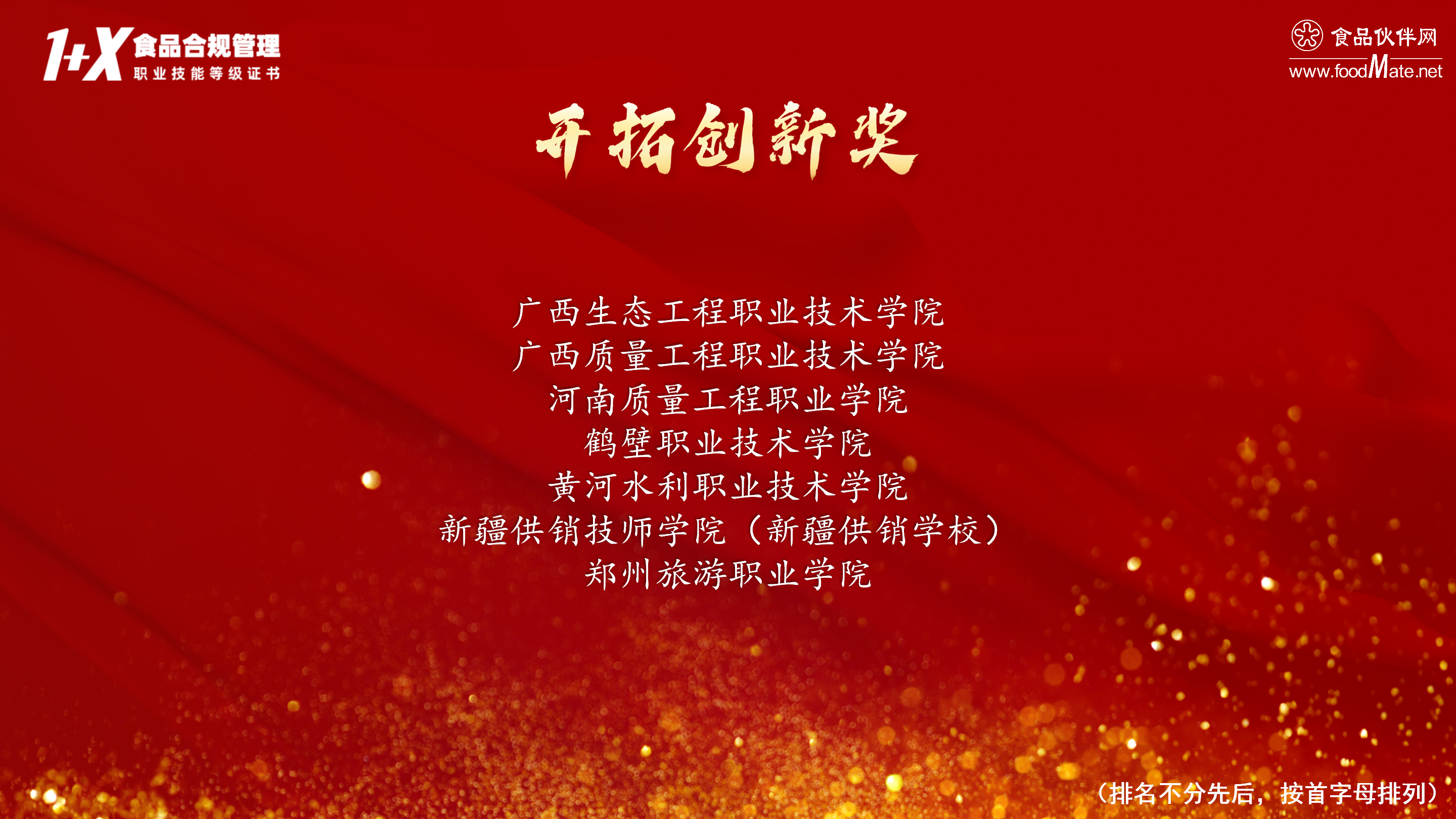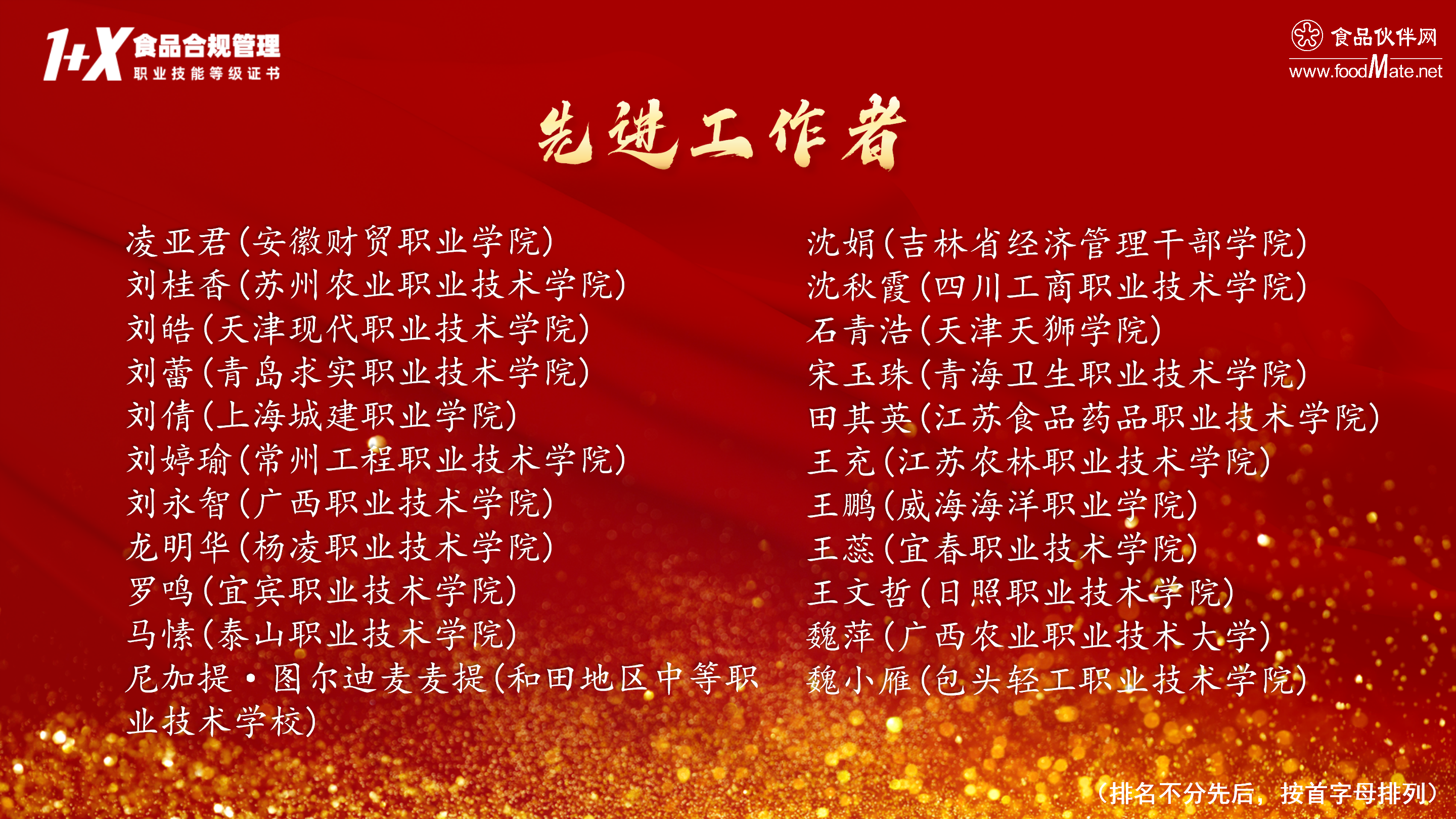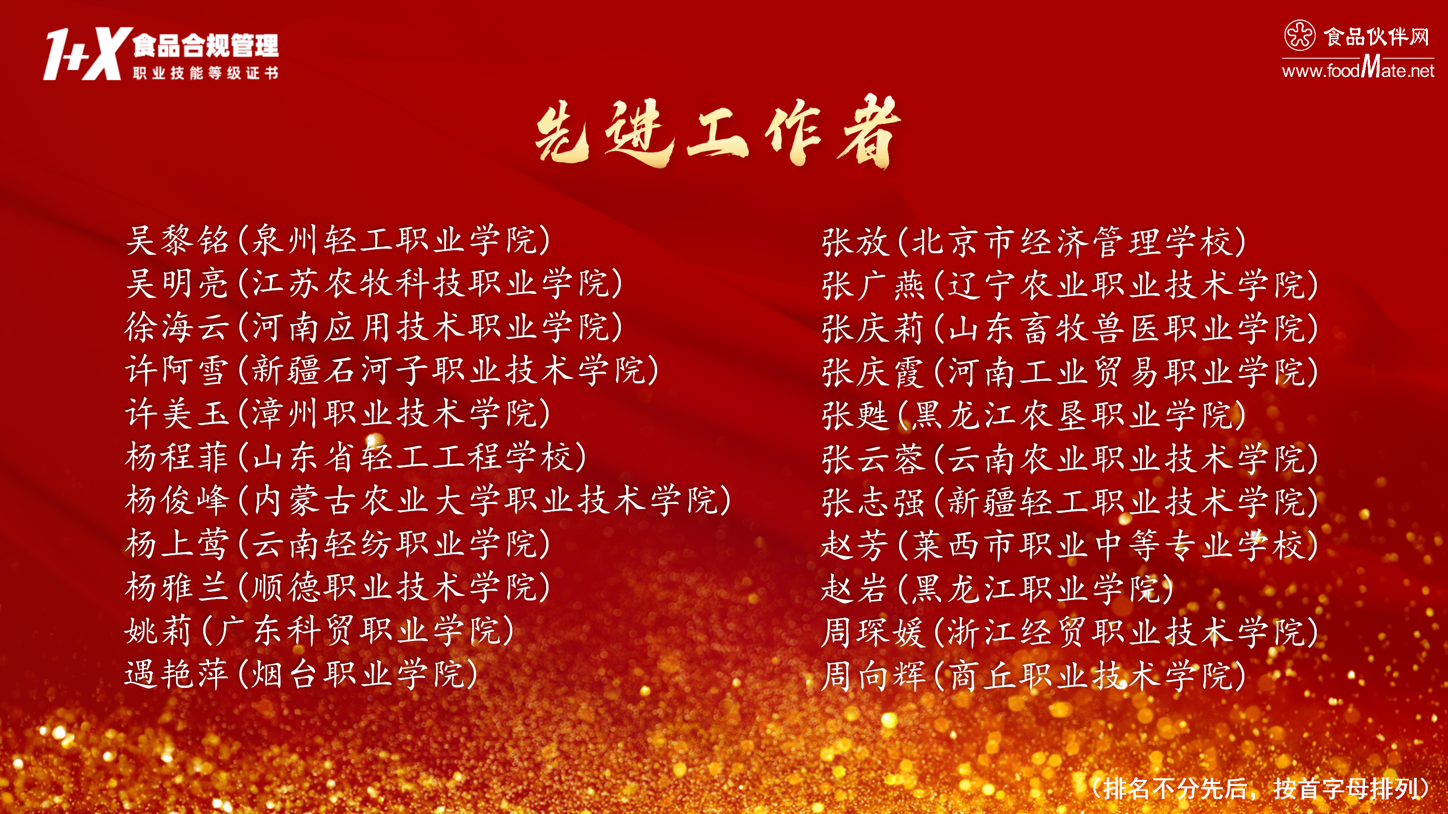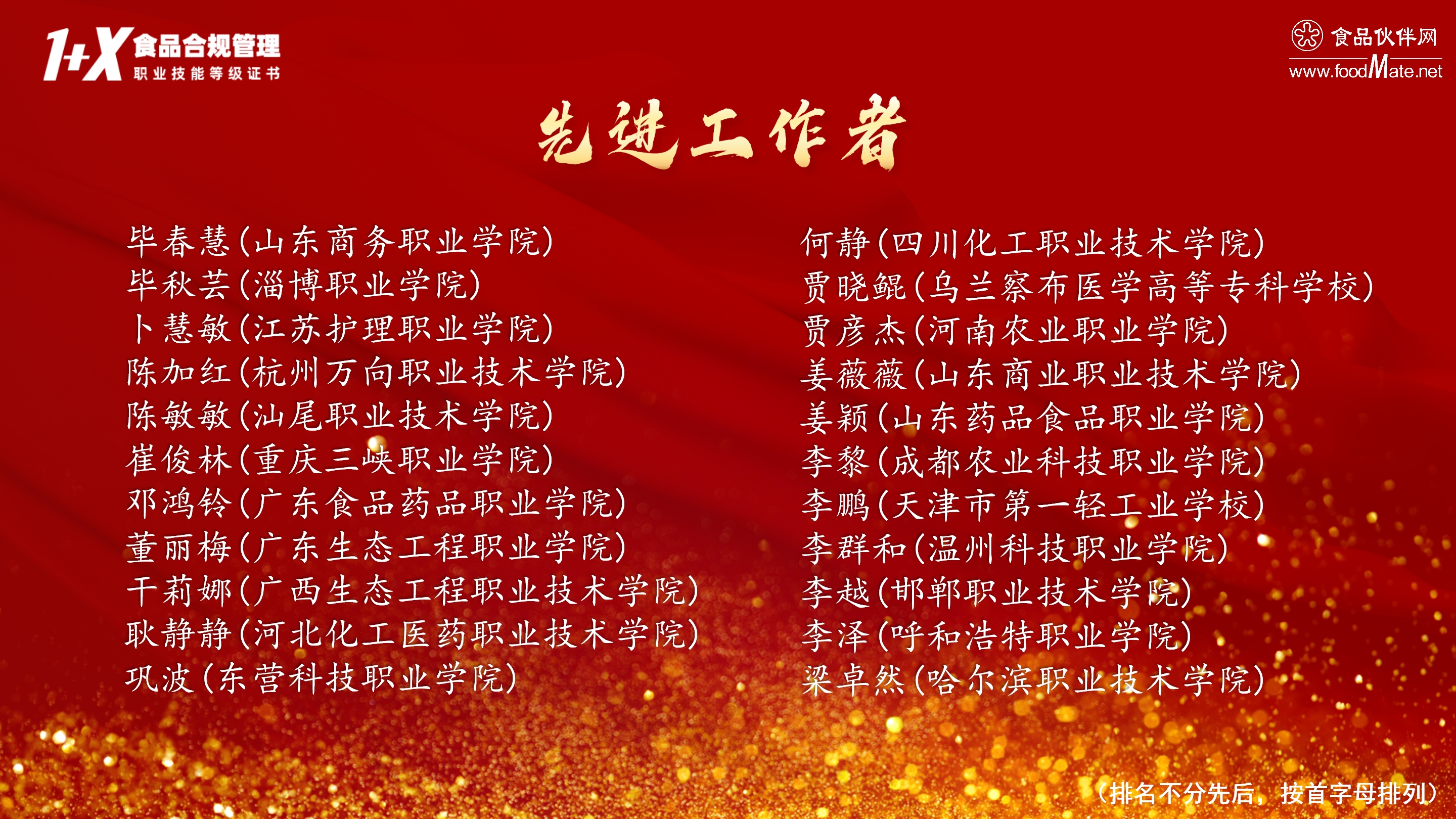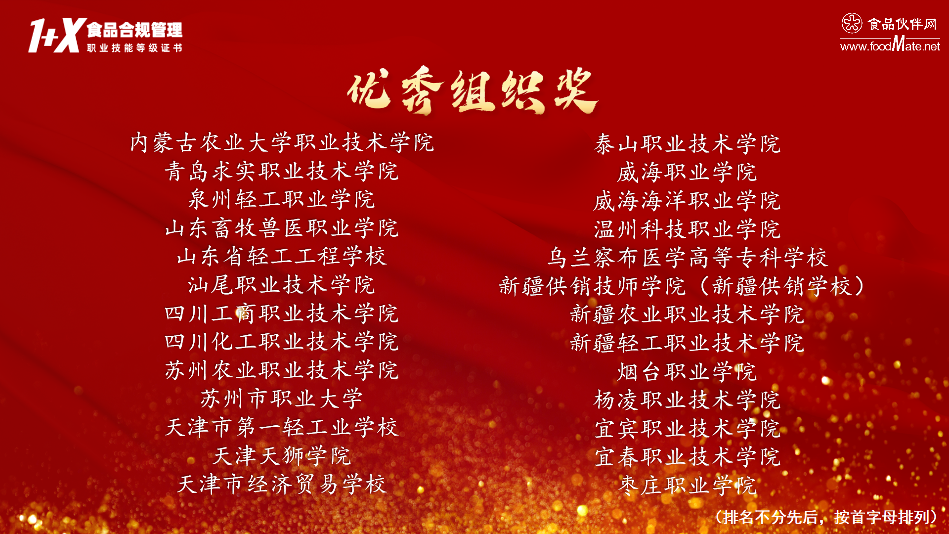 2023年食品伙伴网在证书建设,证书推广,培训教学,教学资源建设以及证书考核方面都取得了较大的突破,这些成绩的取得离不开诸多院校领导老师的指导、帮助和支持!2023年度工作表彰会对优秀院校和个人进行表彰,分别是领军院校奖20个,优秀教学奖31个,全国考核优秀单位37个,优秀组织奖52个,开拓创新奖7个,优秀培训教师62位,先进工作者66位。