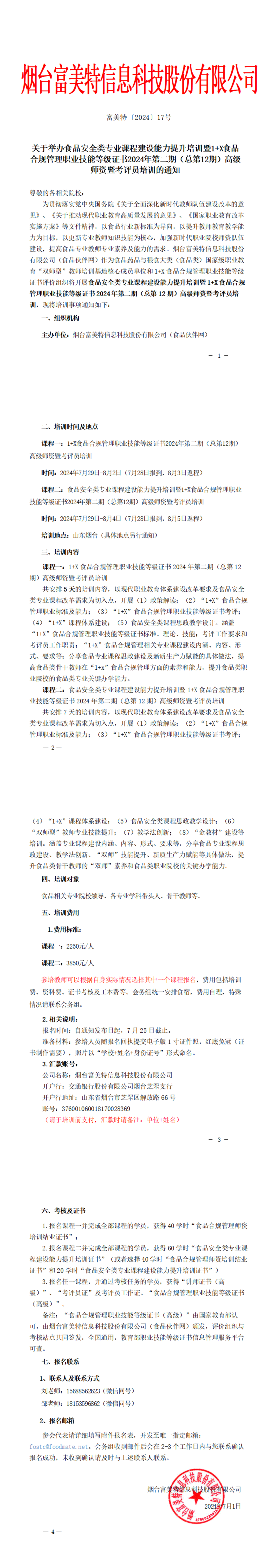 【培训通知】关于举办食品安全类专业课程建设能力提升培训暨1+X食品合规管理职业技能等级证书2024年第二期高级师资暨考评员培训的通知
