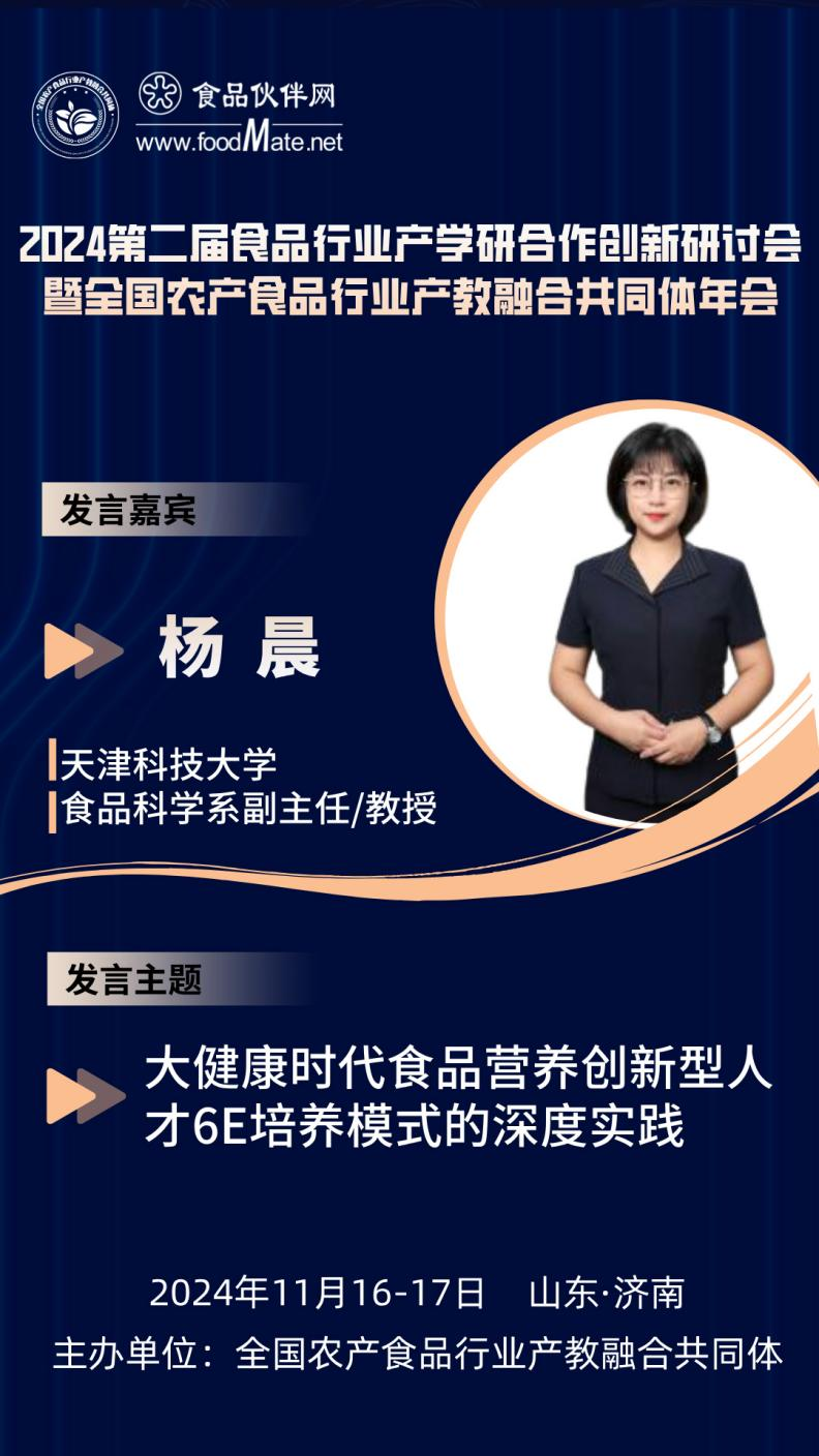 杨晨,天津科技大学食品科学与工程学院副教授,食品科学系副主任,国家级一流本科课程《食品营养学》主讲教师,天津市一流本科课程《食品科学技术导论(双语)》课程负责人,首批天津市高校教师教学创新工作室负责人。