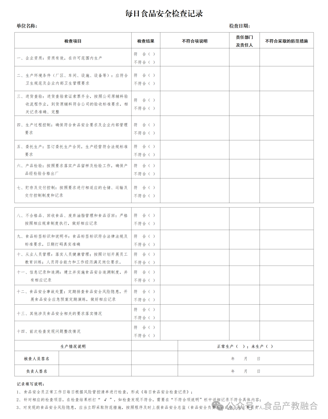 除此之外,还要完成企业的《每日食品安全检查记录》,确保企业食品生产情况据实可查。