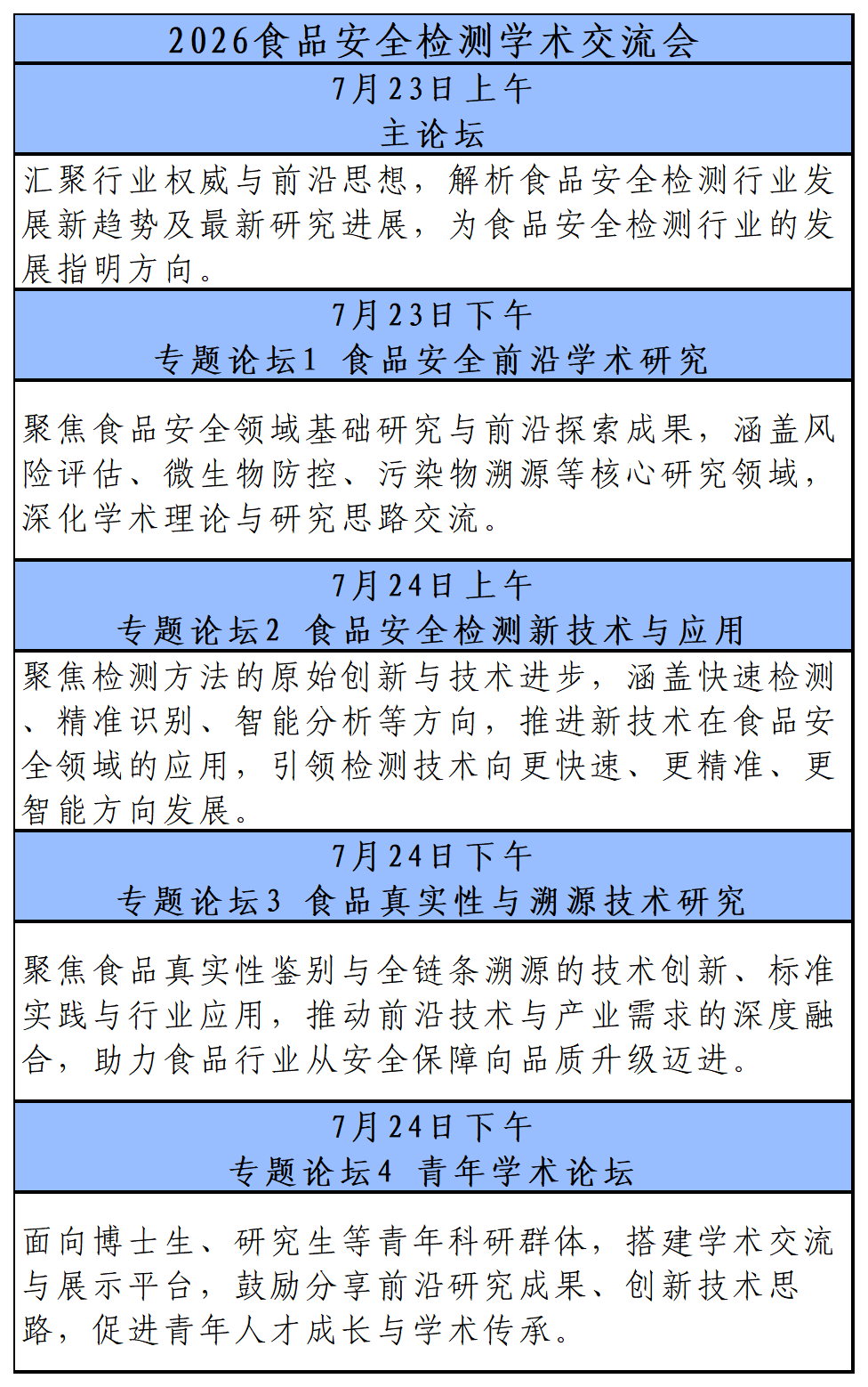 为汇聚产学研多方力量,搭建高水平学术交流平台,分享食品安全前沿学术研究、检测新技术应用、真实性与溯源管控等领域的最新成果与实践经验,由食品伙伴网主办的2026食品安全检测学术交流会将于2026年7月23-24日在上海召开。